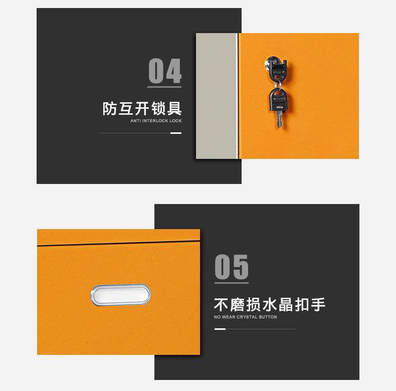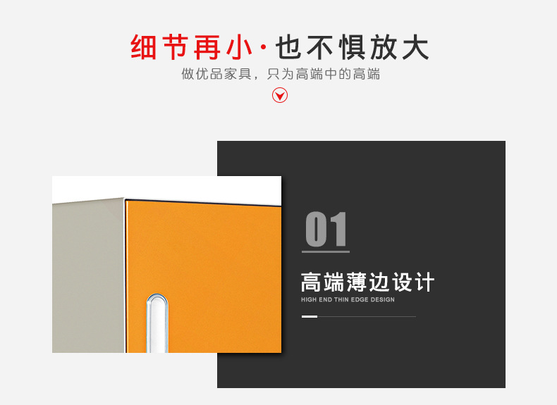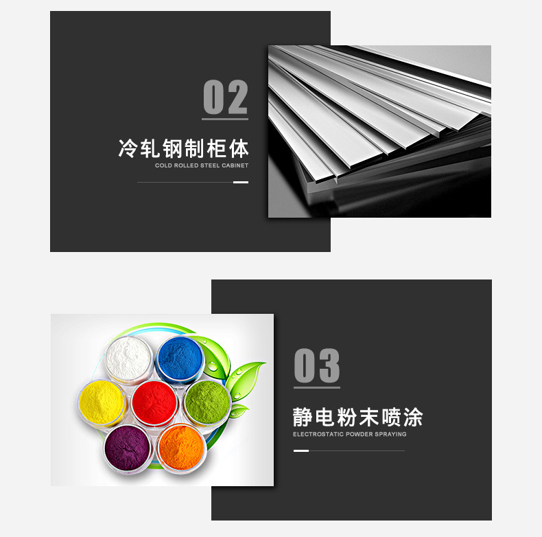 外观专利拉手+钢化玻璃 采用优质冷轧钢板经剪切,冲压,折弯,焊接,装配等九工位精制而成 采用自动喷淋式磷化 粉末静电喷涂,涂膜不易脱落,环保耐用,无毒害,无气味,光洁美观 外观精美,安全系数良好 坚固耐用,承受力强,可存放大量文件资料不变形