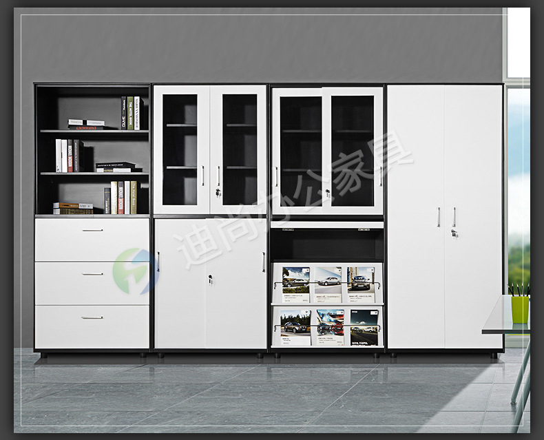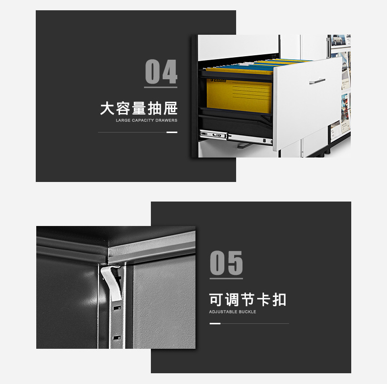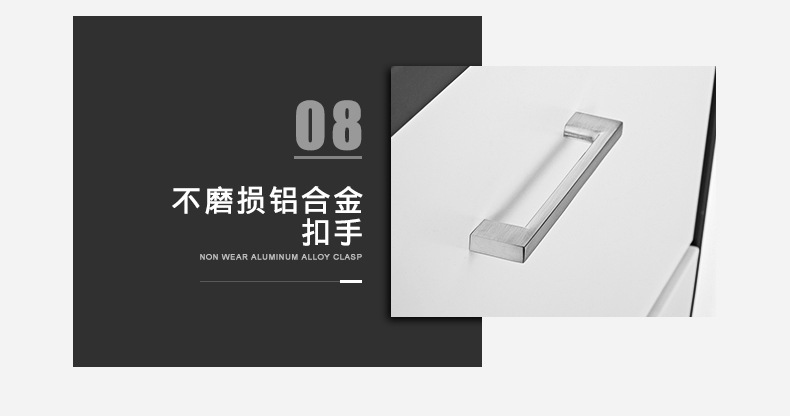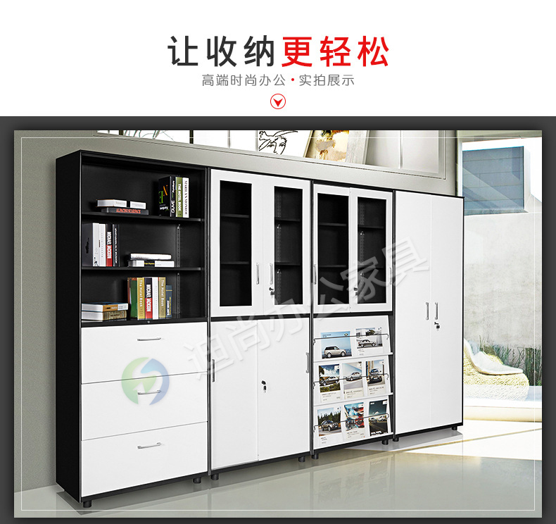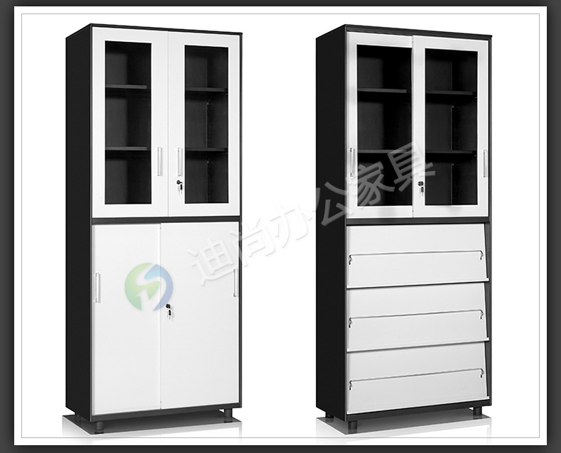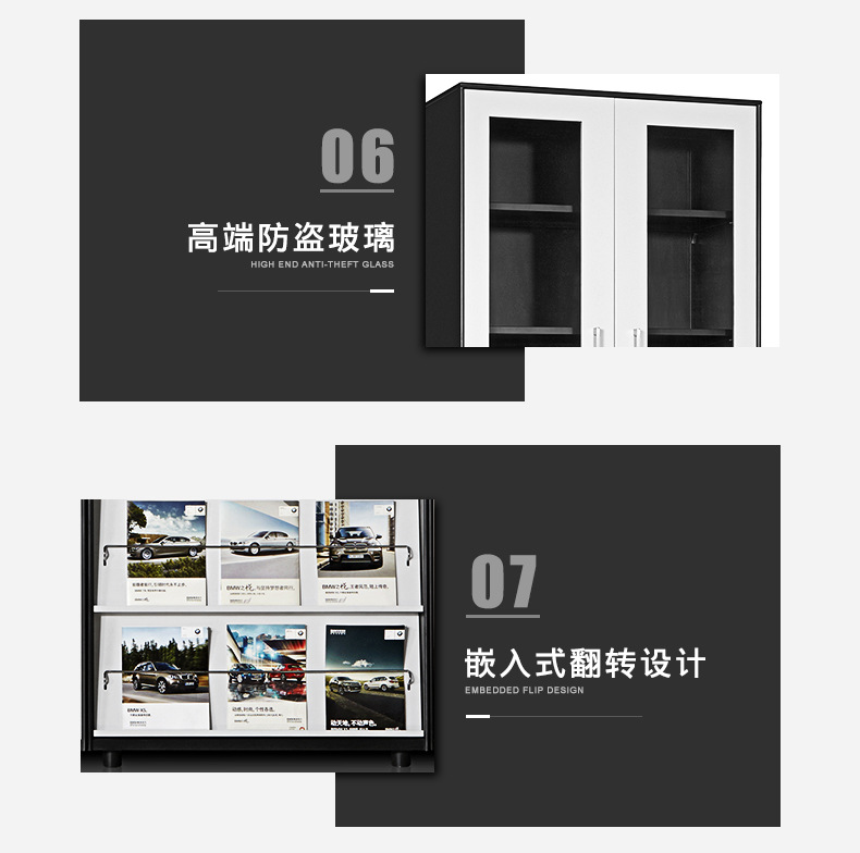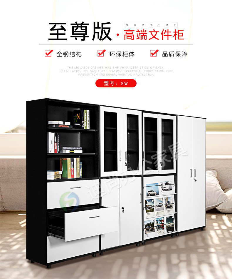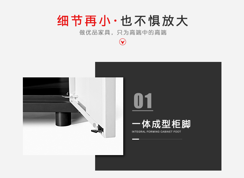 外观专利拉手+钢化玻璃 采用优质冷轧钢板经剪切,冲压,折弯,焊接,装配等九工位精制而成 采用自动喷淋式磷化 粉末静电喷涂,涂膜不易脱落,环保耐用,无毒害,无气味,光洁美观 外观精美,安全系数良好 坚固耐用,承受力强,可存放大量文件资料不变形