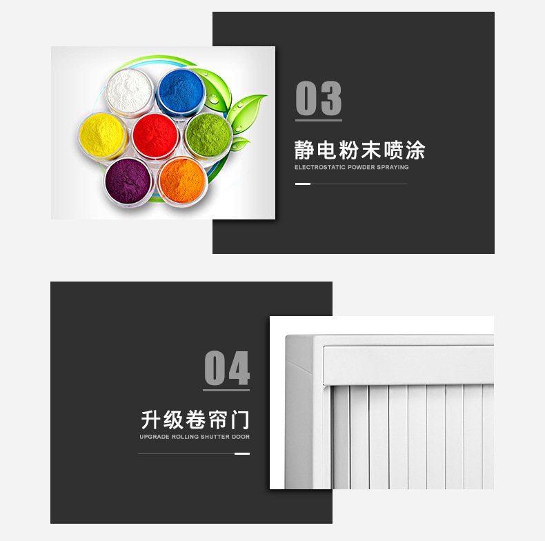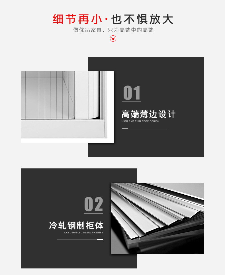 外观专利拉手+钢化玻璃 采用优质冷轧钢板经剪切,冲压,折弯,焊接,装配等九工位精制而成 采用自动喷淋式磷化 粉末静电喷涂,涂膜不易脱落,环保耐用,无毒害,无气味,光洁美观 外观精美,安全系数良好 坚固耐用,承受力强,可存放大量文件资料不变形