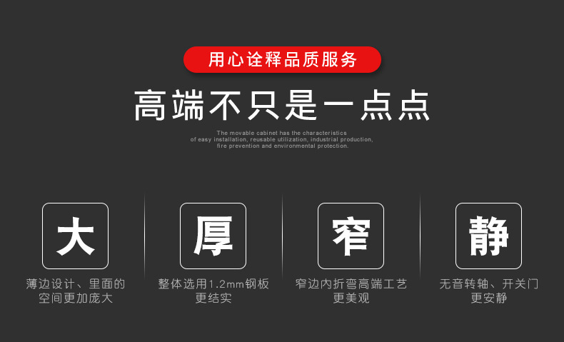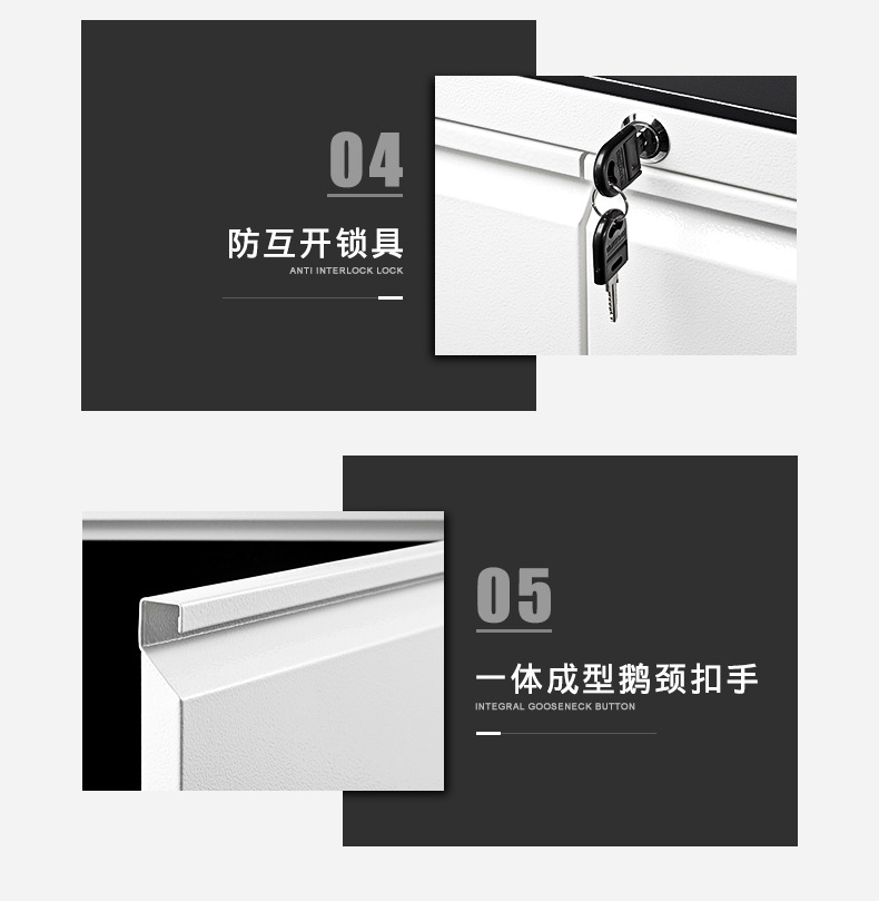 外观专利拉手+钢化玻璃 采用优质冷轧钢板经剪切,冲压,折弯,焊接,装配等九工位精制而成 采用自动喷淋式磷化 粉末静电喷涂,涂膜不易脱落,环保耐用,无毒害,无气味,光洁美观 外观精美,安全系数良好 坚固耐用,承受力强,可存放大量文件资料不变形