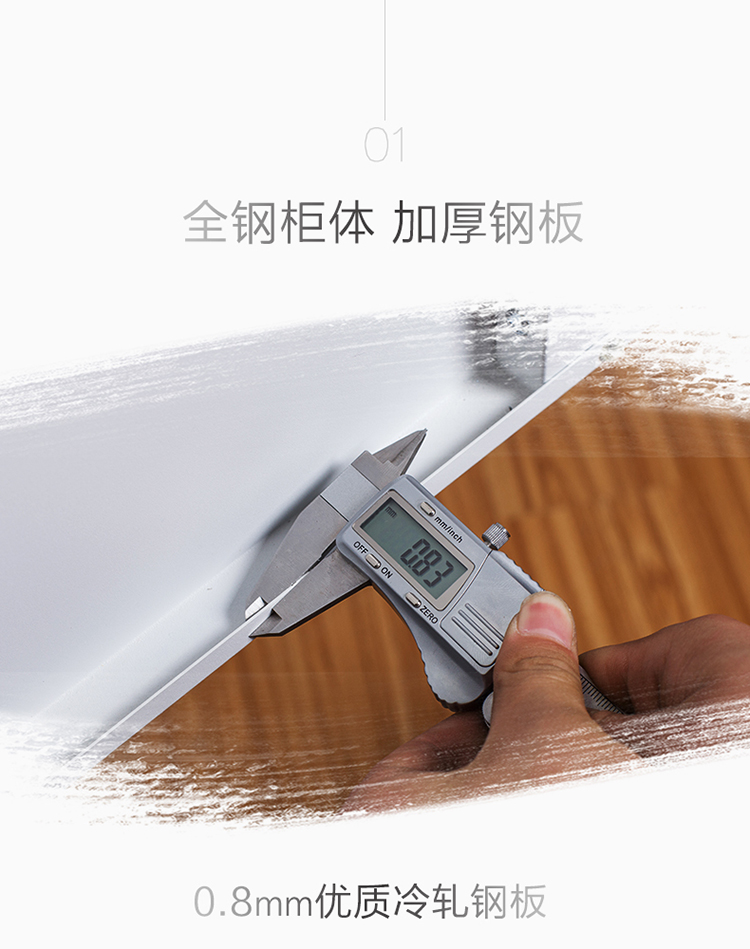 采用优质冷轧钢板经剪切,冲压,折弯,焊接,装配等九工位精制而成 采用自动喷淋式磷化 粉末静电喷涂,涂膜不易脱落,环保耐用,无毒害,无气味,光洁美观 外观精美,安全系数良好 坚固耐用,承受力强,可存放大量文件资料不变形
