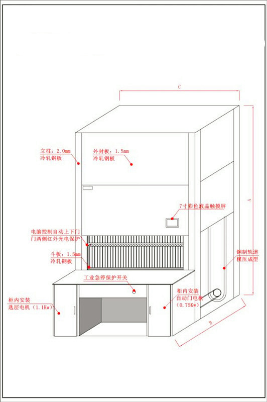 ⑸档案管理报表打印 ⑹运行状态显示 ⑺运行日志纪录 ⑻光幕安全保护 ⑼手动/自动走层 ⑽应急手摆功能