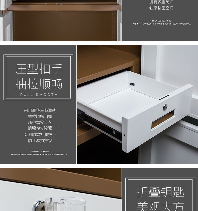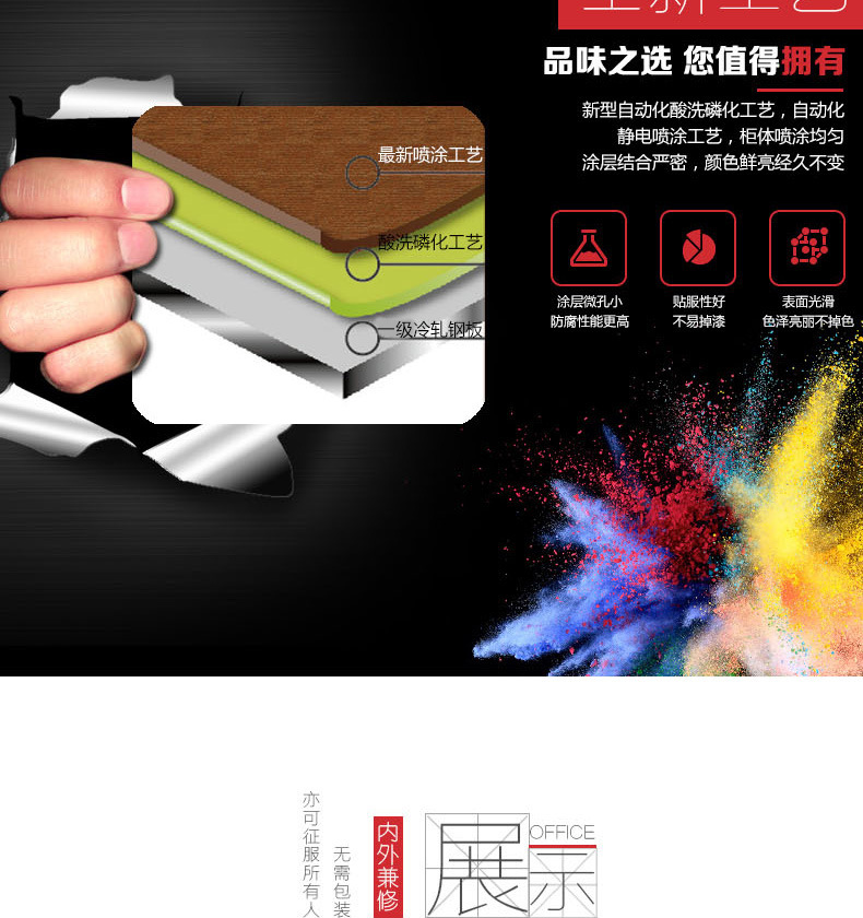 采用优质冷轧钢板经剪切,冲压,折弯,焊接,装配等九工位精制而成 采用自动喷淋式磷化 粉末静电喷涂,涂膜不易脱落,环保耐用,无毒害,无气味,光洁美观 外观精美,安全系数良好