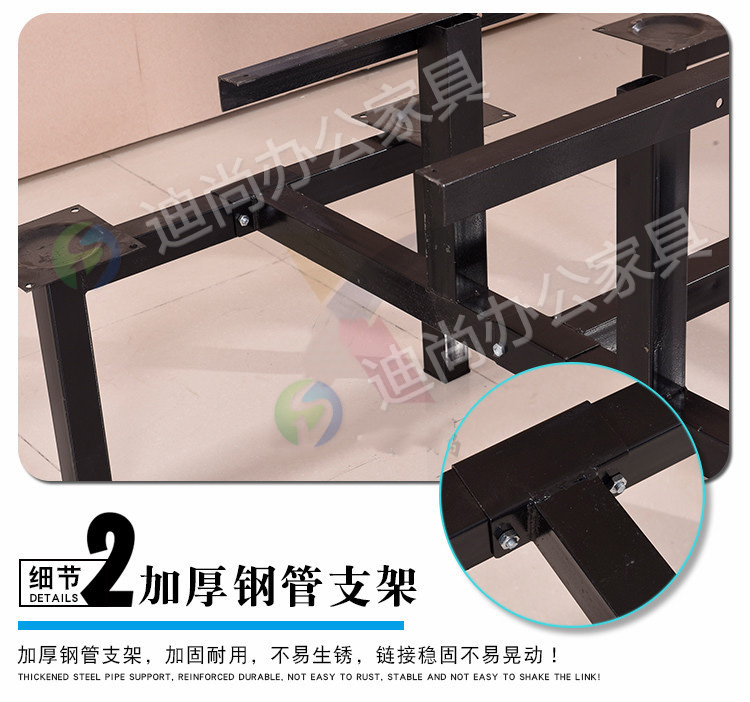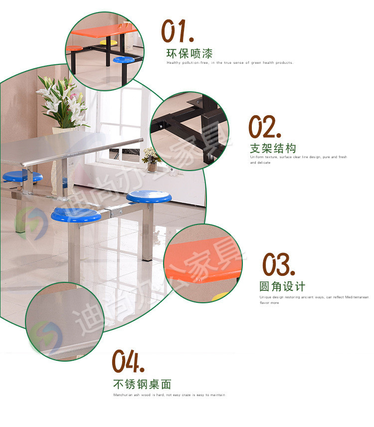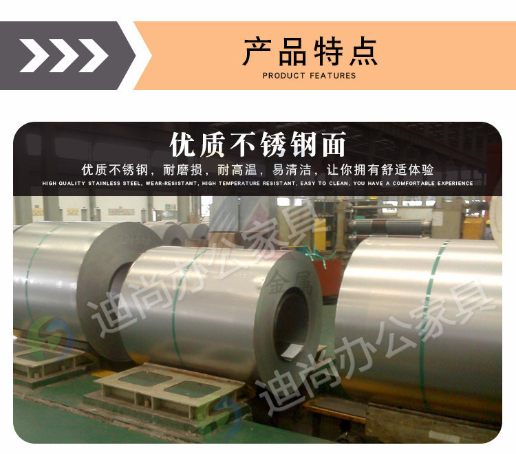 不锈钢桌面 采用优质冷轧钢板经剪切,冲压,折弯,焊接,装配等九工位精制而成 采用自动喷淋式磷化 粉末静电喷涂,涂膜不易脱落,环保耐用,无毒害,无气味,光洁美观 外观精美,安全系数良好 坚固耐用,承受力强,可存放大量文件资料不变形