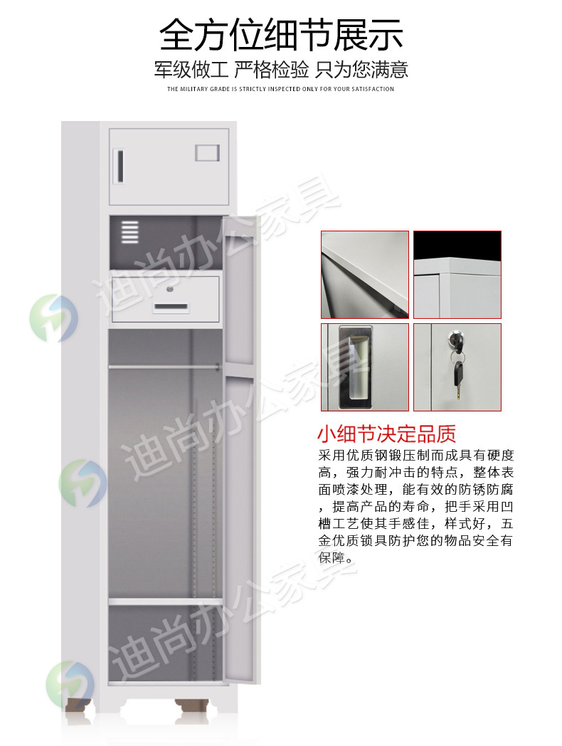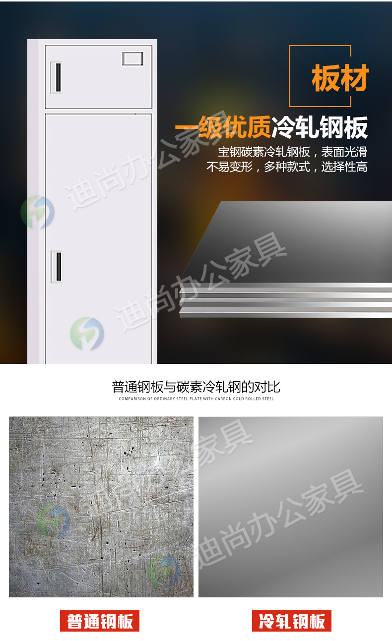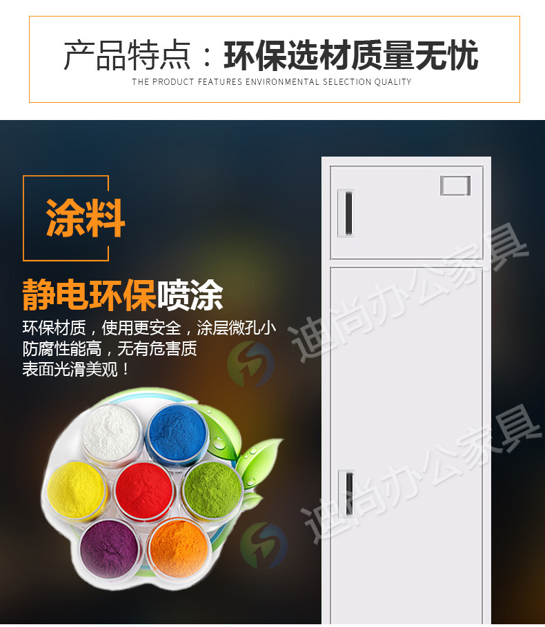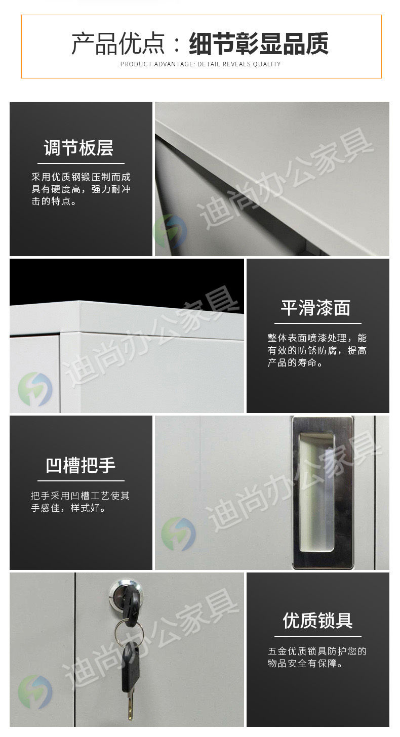 采用优质冷轧钢板经剪切,冲压,折弯,焊接,装配等九工位精制而成 采用自动喷淋式磷化 粉末静电喷涂,涂膜不易脱落,环保耐用,无毒害,无气味,光洁美观 外观精美,安全系数良好 坚固耐用,承受力强,可存放大量文件资料不变形