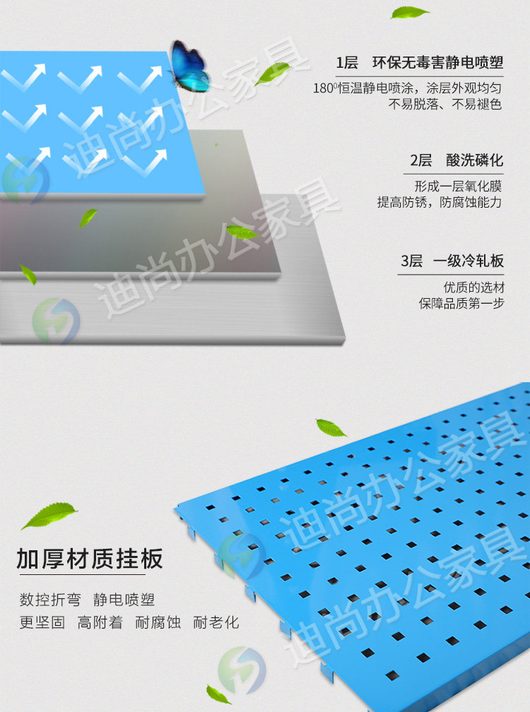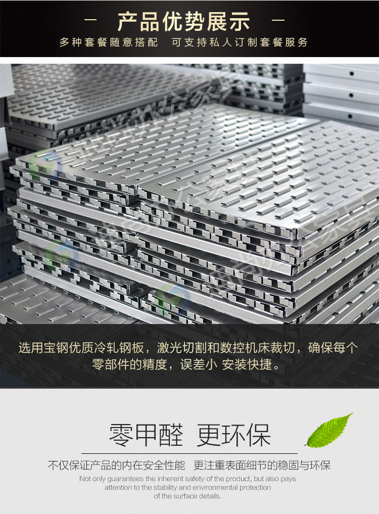 采用优质冷轧钢板经剪切,冲压,折弯,焊接,装配等九工位精制而成 采用自动喷淋式磷化 粉末静电喷涂,涂膜不易脱落,环保耐用,无毒害,无气味,光洁美观 外观精美,安全系数良好 坚固耐用,承受力强,可存放大量文件资料不变形