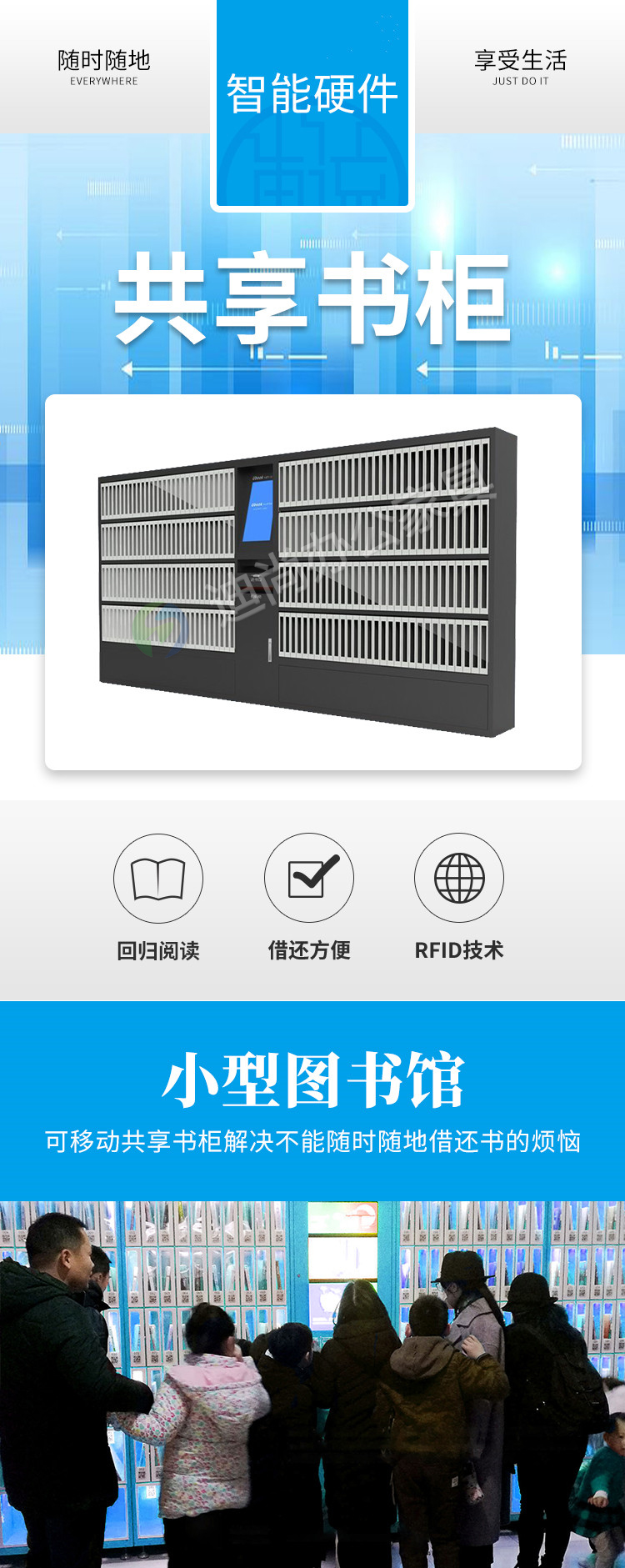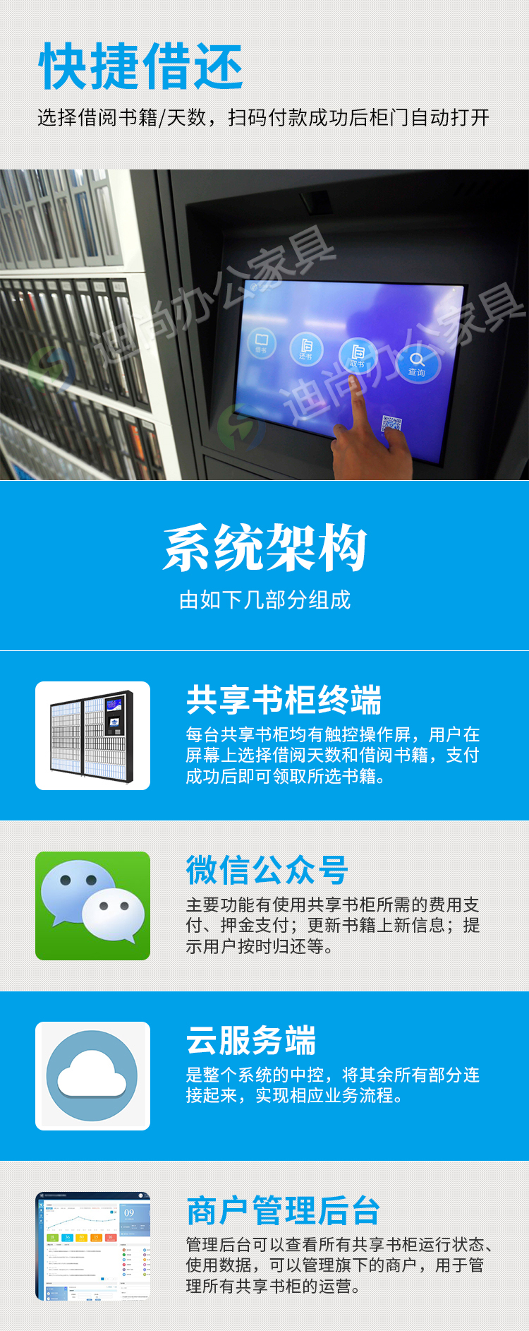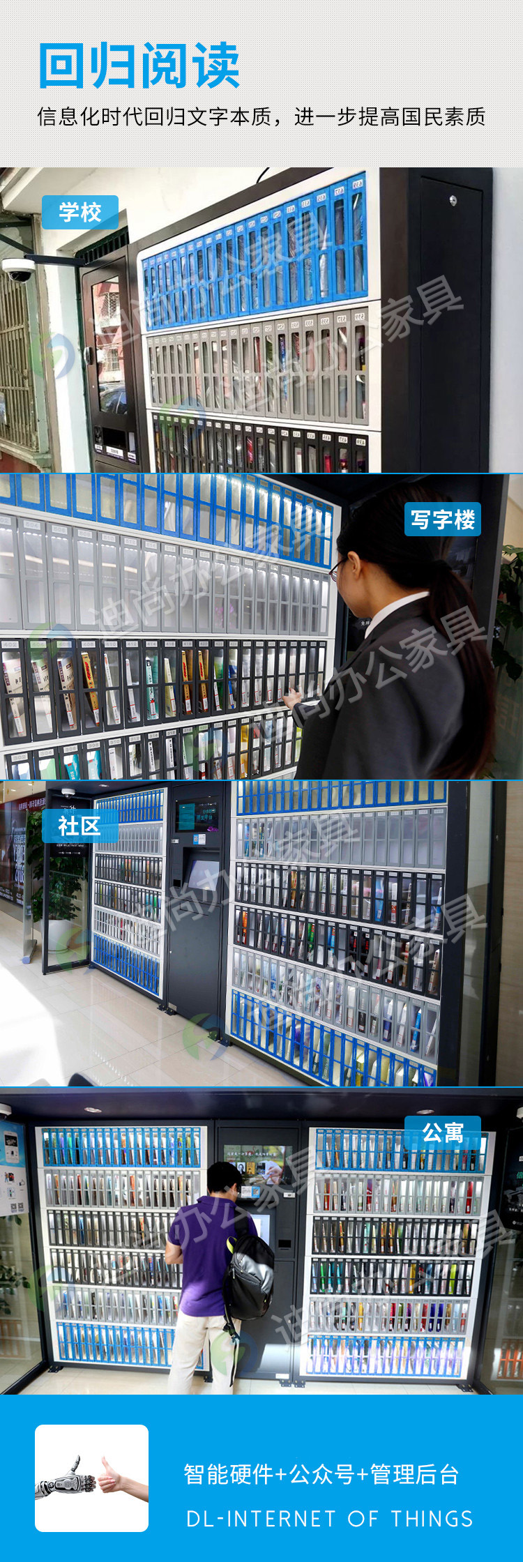 投放学校图书馆、实现收益 采用优质冷轧钢板经剪切,冲压,折弯,焊接,装配等九工位精制而成 采用自动喷淋式磷化 粉末静电喷涂,涂膜不易脱落,环保耐用,无毒害,无气味,光洁美观 外观精美,安全系数良好 坚固耐用,承受力强,可存放大量物品不变形