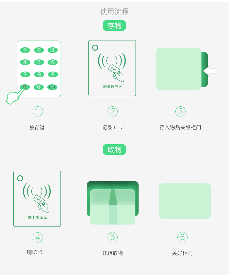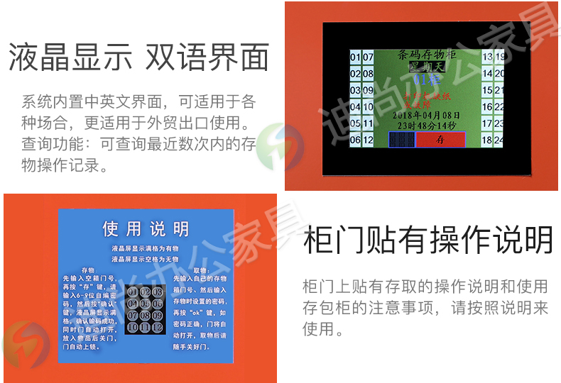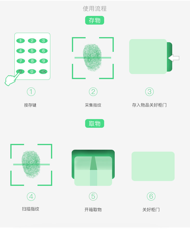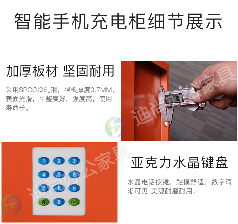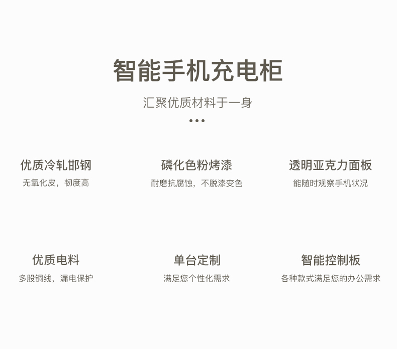 智能系统开门、链接后台开门,可使用指纹、刷卡、自设密码、人脸识别、微信扫码、条码、投币式开门方式 手机存放+手机充电 采用优质冷轧钢板经剪切,冲压,折弯,焊接,装配等九工位精制而成 采用自动喷淋式磷化 粉末静电喷涂,涂膜不易脱落,环保耐用,无毒害,无气味,光洁美观 外观精美,安全系数良好 坚固耐用,承受力强,可存放大量文件资料不变形